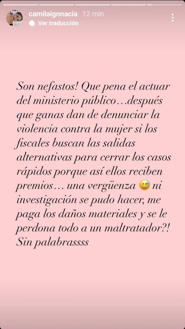 Esta salida alternativa, eso sí, no cayó para nada bien en la víctima, quien se descargó en Redes Sociales: “¡Son nefastos! Qué pena el actuar del Ministerio Público… después qué ganas dan de denunciar la violencia contra la mujer si los fiscales buscan salidas alternativas para cerrar los casos rápidos porque así ellos reciben premios”.