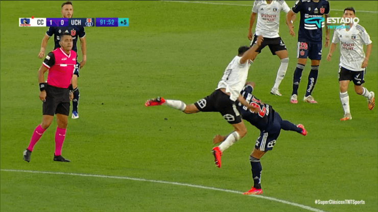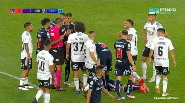 El capitán de Colo Colo ve la tarjeta roja directa tras golpear al mediocampista de la Universidad de Chile en una disputa de balón aéreo.