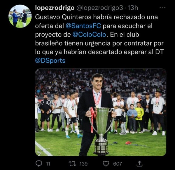 Según información del periodista Rodrigo López en su cuenta de Twitter, el actual estratega del ‘Cacique’ habría rechazado una concreta oferta que le llegó desde el Santos de Brasil, quien busca un sucesor al interinato que lleva hasta día de hoy con Orlando Ribeiro y que esperaba poder suplir con Gustavo Quinteros pensando en la próxima temporada, pero que esto no sucederá ante la desaprobación del DT de Colo Colo.