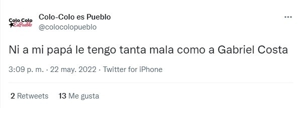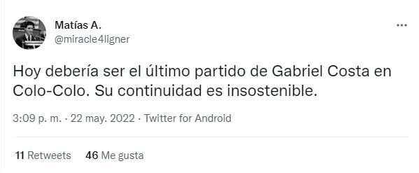 La nueva expulsión de Costa -quien fue expulsado en el compromiso ante Cobresal hace un par de fechas-, sumado al bajo nivel que exhibió ante Rive Plate, gatilló en la furia de los hinchas colocolinos que se volcaron a las Redes Sociales para expresar su descontento ante el jugador peruano.