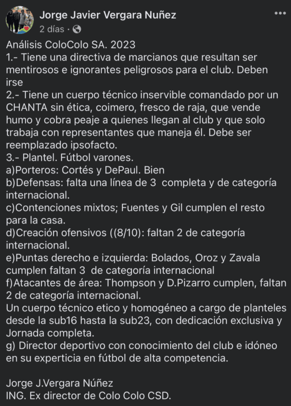“Tiene un cuerpo técnico inservible comandado por chanta sin ética, coimero (sic), fresco de raja (sic), que vende humo y cobra peaje a quiénes llegan al club y que sólo trabaja con representantes que maneja él (sic)”, indicó Vergara a través de su cuenta de Facebook.