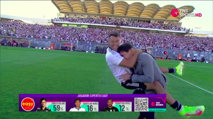 Es que una vez finalizado el partido el recinto de Pedrero, el delantero albo Iván Morales se acercó al técnico del Cacique, le realizó una especie de koala en la mitad de la cancha y ambos se fueron al suelo en el césped del Monumental, lo cual no pasó desapercibido.