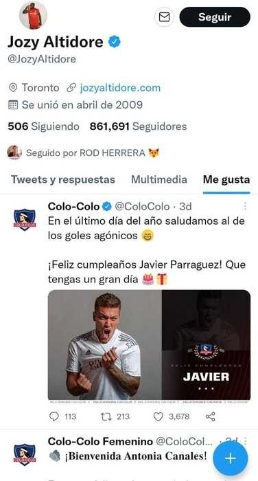 Se trata del estadounidense y ex mundialista de Sudáfrica 2010 y Brasil 2014, Jozy Altidore. En Redes Sociales, el delantero del Toronto FC le dio ‘me gusta’ a dos publicaciones albas: el saludo de cumpleaños a Javier Parraguez y la contratación de Antonia Canales al equipo femenino de Colo Colo.