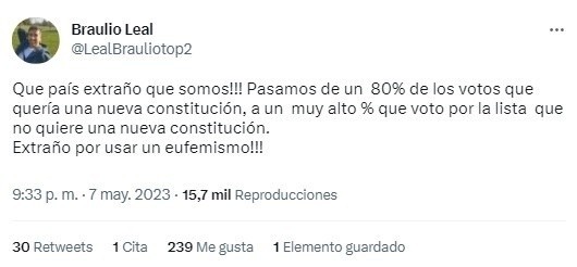 “Qué país extraño que somos. Pasamos de un 80% de los votos que quería una nueva Constitución, a un muy alto % que votó por la lista que no quiere una nueva Constitución. Extraño por usar un eufemismo”, declaró el exvolante.