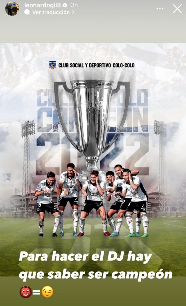 “Para hacer el DJ hay que saber ser campeón”, escribió en un posteo con un emoji de diablo dejando cero cuestión a la imaginación por parte de Leonardo Gil. En la imagen, el mediocampista está con Bouzat, Lucero, Pavez, Opazo y Suazo.