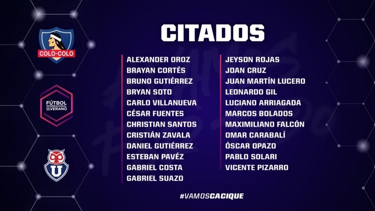 Mediante las redes sociales se confirmó la lista de citados de los futbolistas que tendrá disponible el entrenador albo Gustavo Quinteros, la cual cuenta con la presencia de los tres refuerzos que se han confirmado hasta el momento: Cristian Zavala, Esteban Pavez y Juan Martín Lucero.