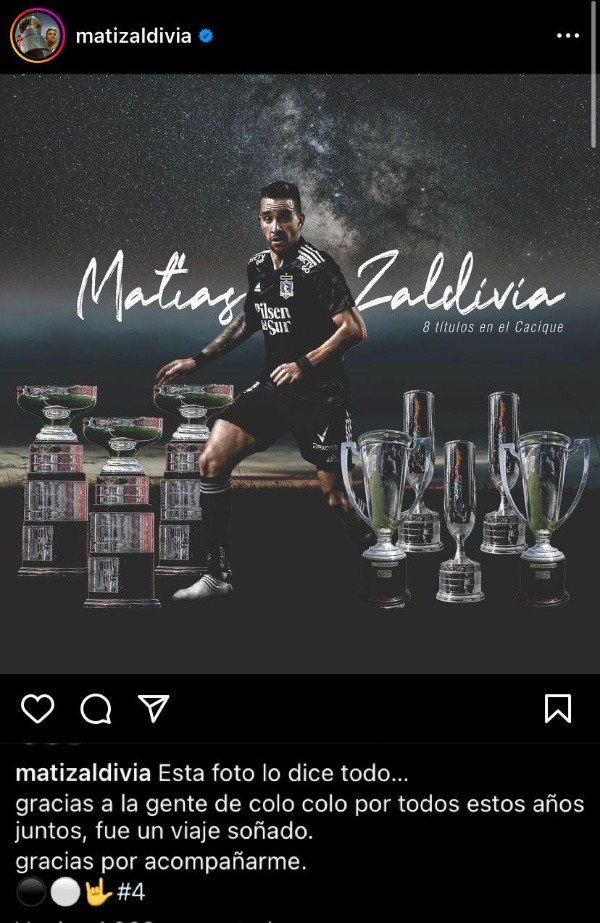 En esta jornada, Zaldivia tomó su cuenta de instragram para despedirse de manera oficial de Colo Colo, dejando atrás siete importantes años de su carrera con el ‘Popular’, en la que solo tuvo palabras de agradecimiento para el club.