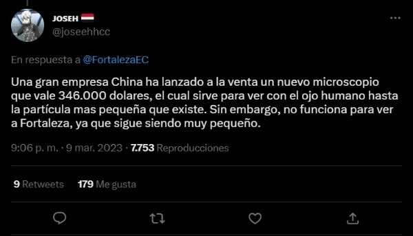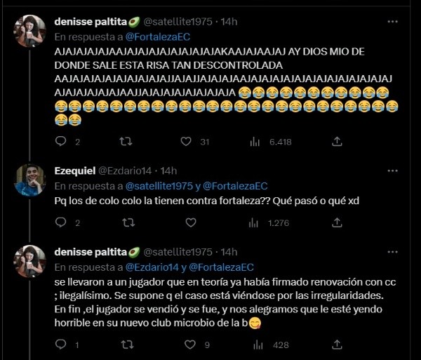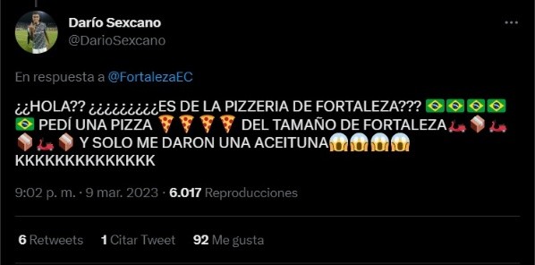 “Eso pasa porque Fortaleza es un equipo muy pequeño y nunca ha ganado copas, nunca serás Palmeiras, Flamengo o Atlético Mineiro. Me río toda la noche” escribió un hincha albo en la cuenta de Twitter de Fortaleza, mientras que varios postearon prolongadas risas en el post del club brasileño.