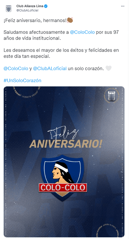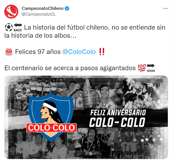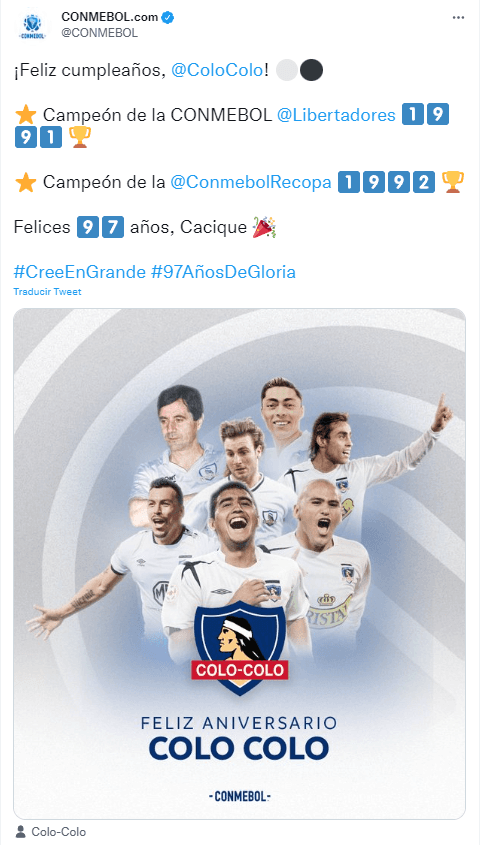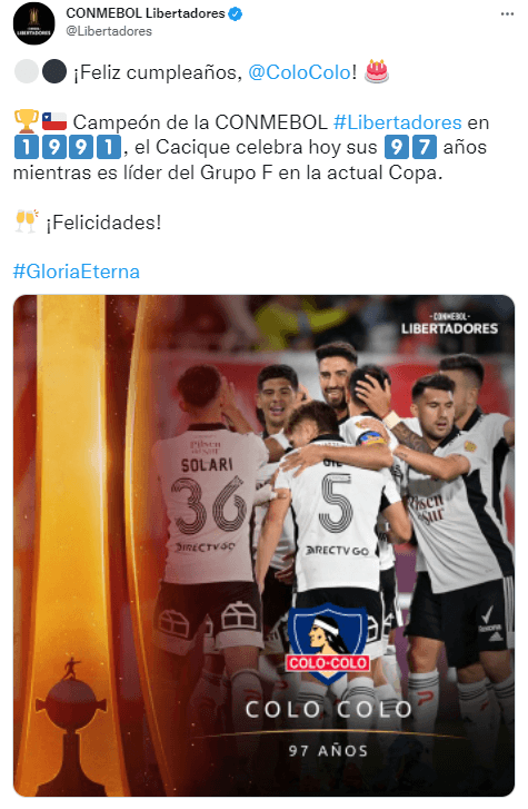 0:01 horas: Las redes sociales de la Copa Libertadores enviaron su saludo a Colo Colo en los 97 años de existencia.