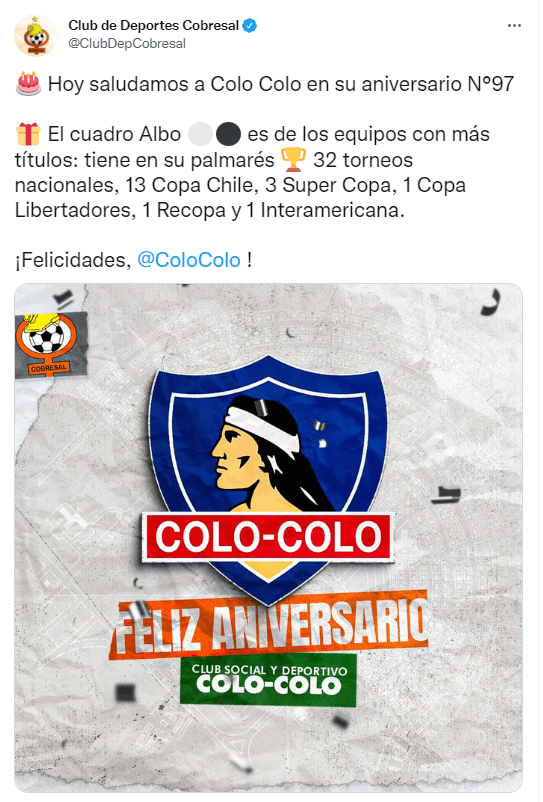 10:18 horas: Deportes Concepción también se tomó el tiempo para enviar un cariñoso saludo a Colo Colo en este nuevo aniversario.