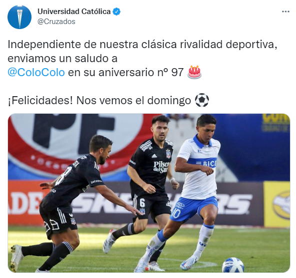 10:02 horas: Universidad Católica, próximo rival de Colo Colo en el Campeonato Nacional, también envió sus saludos.
