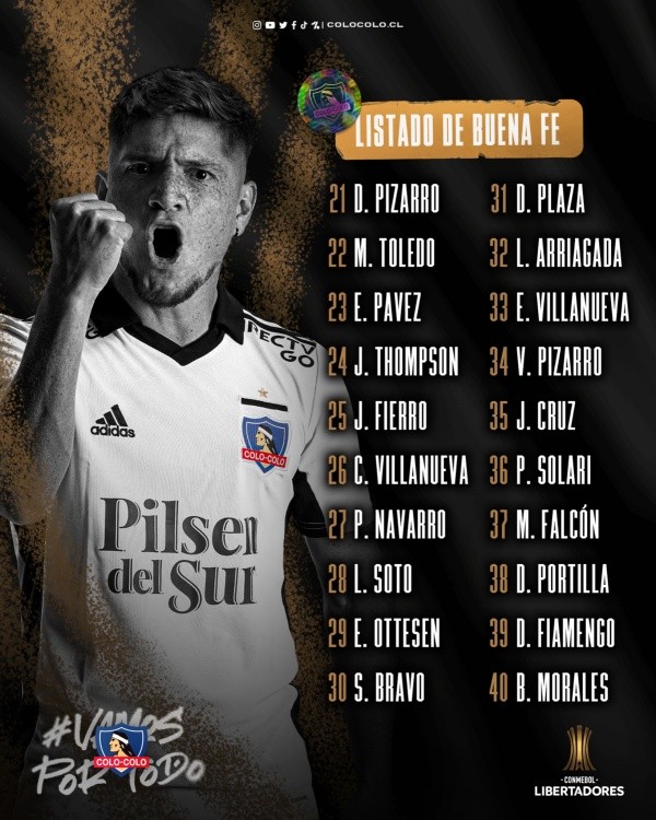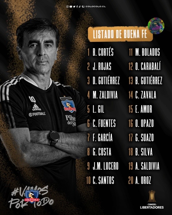 Colo Colo tiene definida su listade buena fe para la Copa Libertadores 2022 donde compartirá el grupo F con River Plate, Alianza Lima y Fortaleza. El objetivo del Cacique es ser competitivo en la máxima competición continental y luchar por la clasificación a los octavos de final.