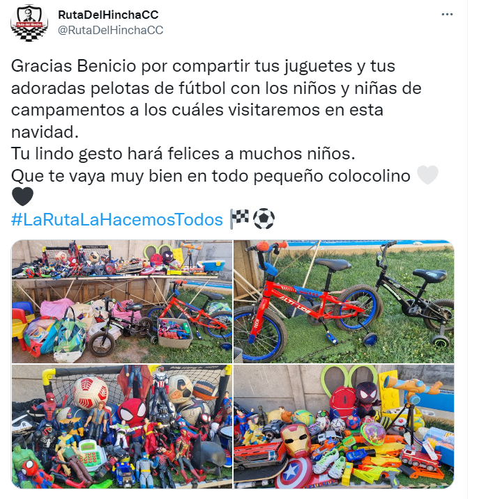 “Gracias Benicio por compartir tus juguetes y tus adoradas pelotas de fútbol con los niños y niñas de campamentos a los cuáles visitaremos en esta navidad.Tu lindo gesto hará felices a muchos niños. Que te vaya muy bien en todo pequeño colocolino”, indicaron en la red del pajarito.