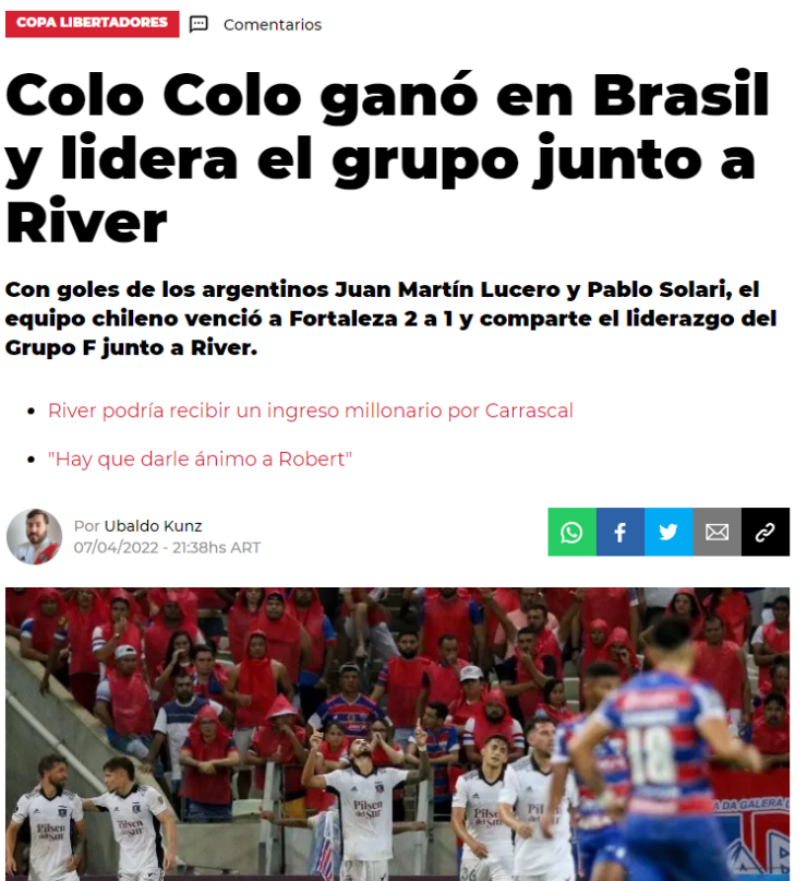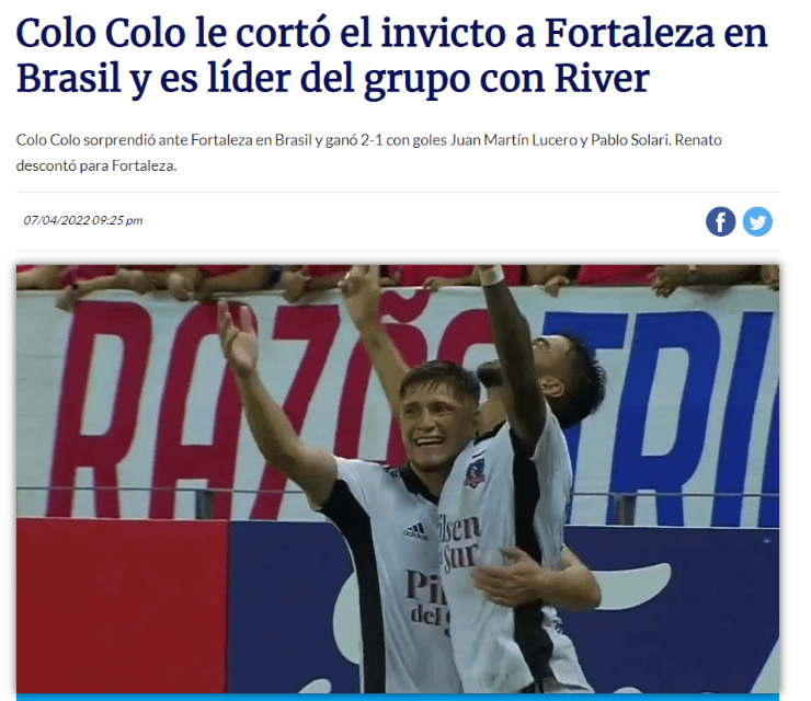 “Colo Colo le cortó el invicto a Fortaleza en Brasil y es líder del grupo con River” titularon en la nota resumen del partido en TyC Sports. Pero no fueron los únicos, debido a que también otro de los medios reconocidos en el fútbol argentino como el Diario Olé se sumó al carro de Gustavo Quinteros.