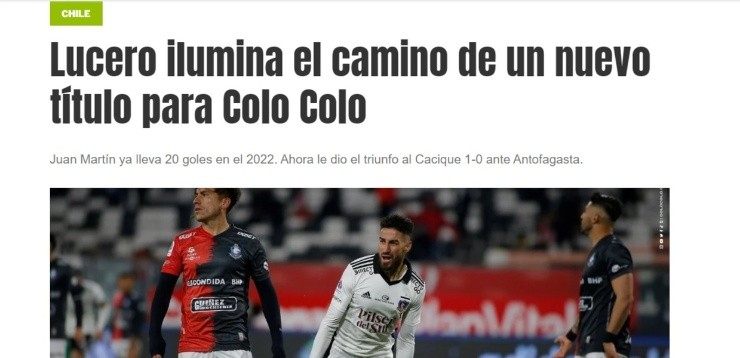 Lo que no pasó desapercibido fue el nuevo gol de Lucero, quien fue elogiado en la prensa argentina. El portal Olé resalta que “Sus 20 goles en lo que va del 2022 certifican las razones por las que Colo Colo va camino al título en el fútbol chileno. Juan Martín Lucero, el mendocino con pasos por Defensa y Justicia, Independiente, Godoy Cruz y Vélez, sigue con su marcha imparable”.