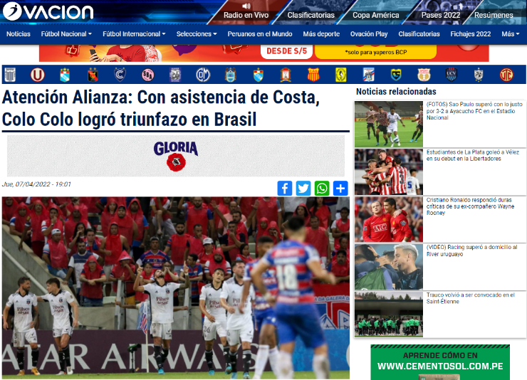 Es en esta parte donde la prensa peruana le mandó un pequeño recado de preocupación al club limeño, teniendo en cuenta el cuadro albo ganó en Brasil. “Atención Alianza: Con asistencia de Costa, Colo Colo logró triunfazo en Brasil” titularon en Ovación.