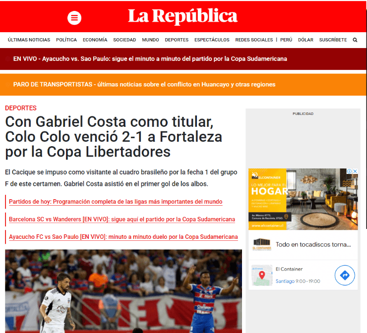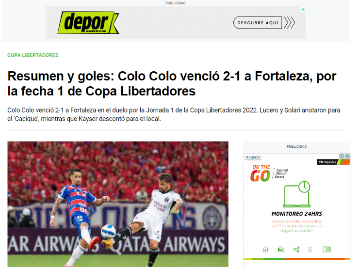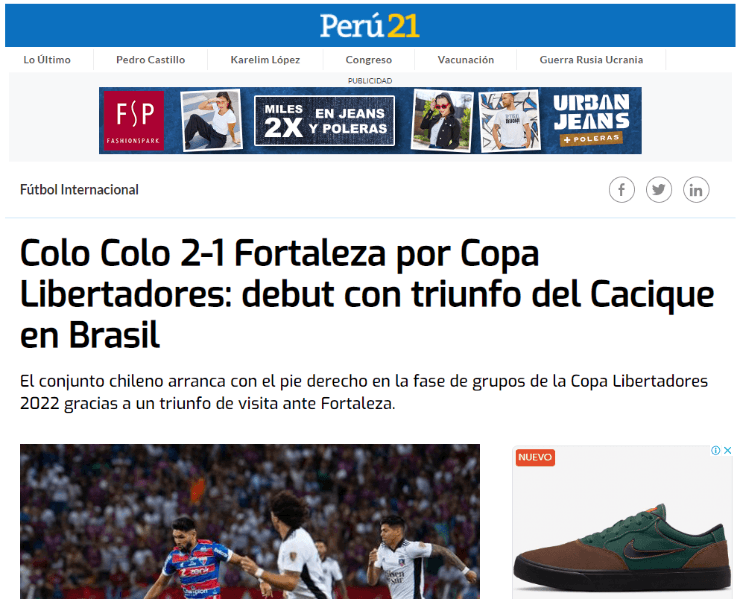 Pero no fueron los únicos, ya que también en Perú21 estuvieron pendiente de la victoria alba. “Debut con triunfo del Cacique en Brasil”. Quienes tampoco se quedaron fuera del triunfo colocolino fueron en La República donde mencionaron “Con Gabriel Costa como titular, Colo Colo venció 2-1 a Fortaleza por la Copa Libertadores”.