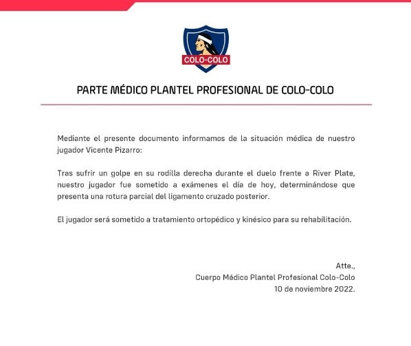 Hace instantes en Colo Colo dieron a conocer el parte médico sobre la lesión que sufrió su volante Vicente Pizarro en el duelo amistoso ante River Plate
