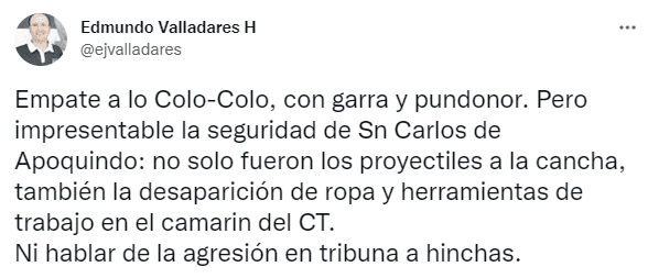 “Empate a lo Colo-Colo, con garra y pundonor. Pero impresentable la seguridad de Sn Carlos de Apoquindo: no solo fueron los proyectiles a la cancha, también la desaparición de ropa y herramientas de trabajo en el camarín del CT. Ni hablar de la agresión en tribuna a hinchas”, fueron las palabras que escribió Edmundo Valladares.