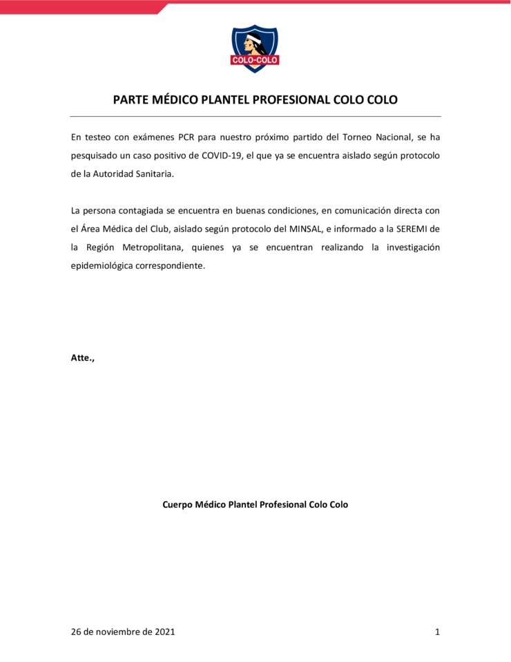 “La persona contagiada se encuentra en buenas condiciones, en comunicación directa con el Área Médica del Club, aislado según protocolo del MINSAL, e informado a la SEREMI de la Región Metropolitana, quienes ya se encuentran realizando la investigación epidemiológica correspondiente”, agregó el conjunto albo en su reporte.