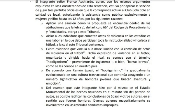 En el fallo, el cual es de público acceso mediante la web de la ANFP, Acchiardo expone seis puntos del por qué el castigo, en caso de haber sido distinto, podría haber ayudado a la erradicación gradual de la violencia en los estadios.
