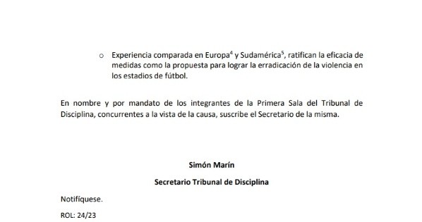 Uno de los puntos que expone Acchiardo dice que “Aislar a los individuos que cometen actos de violencia en los estadios es una labor en la que debe participar toda la institucionalidad vinculada al fútbol, a la cual este Tribunal pertenece”.