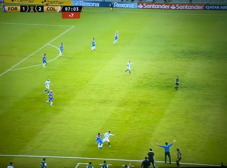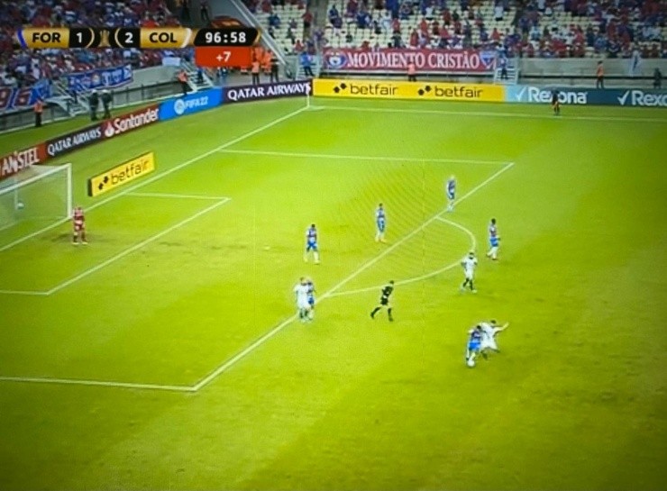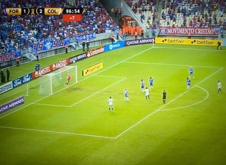 Pero hay una jugada cuando terminaba el partido que fue muy comentada en las diversas redes sociales.Transcurría el minuto 97′ de partido cuando en el Populartenía una ventaja de 2-1 en el marcador, César Fuentes llegó hasta el área del conjunto brasileño para sacar un fuerte remate, disparo que dio en el travesaño.