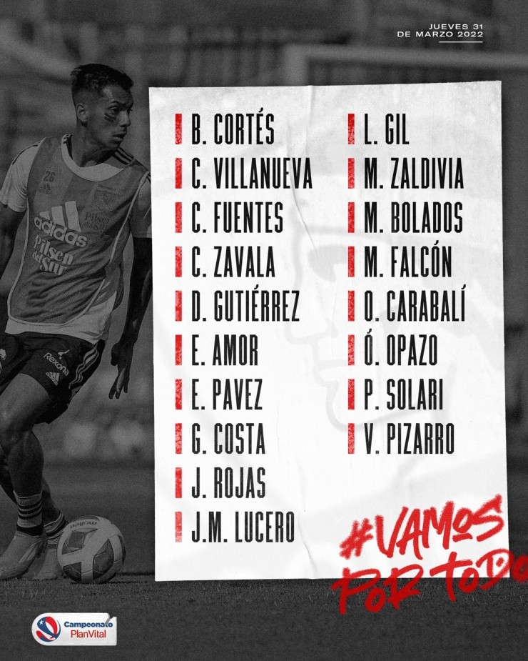 Gabriel Suazo queda fuera de esta convocatoria producto de la seguidilla de partido con la selección. Mientras que la sorpresiva lista quedó fuera del partido los nombres como Alexander Oroz, Christian Santos y Joan Cruz.
