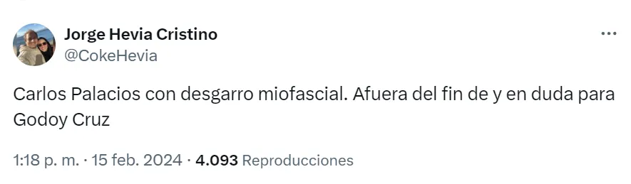“Carlos Palacios con desgarro miofascial. Afuera del fin de semana y en duda para Godoy Cruz”, publicó el conductor de Radio Pauta.