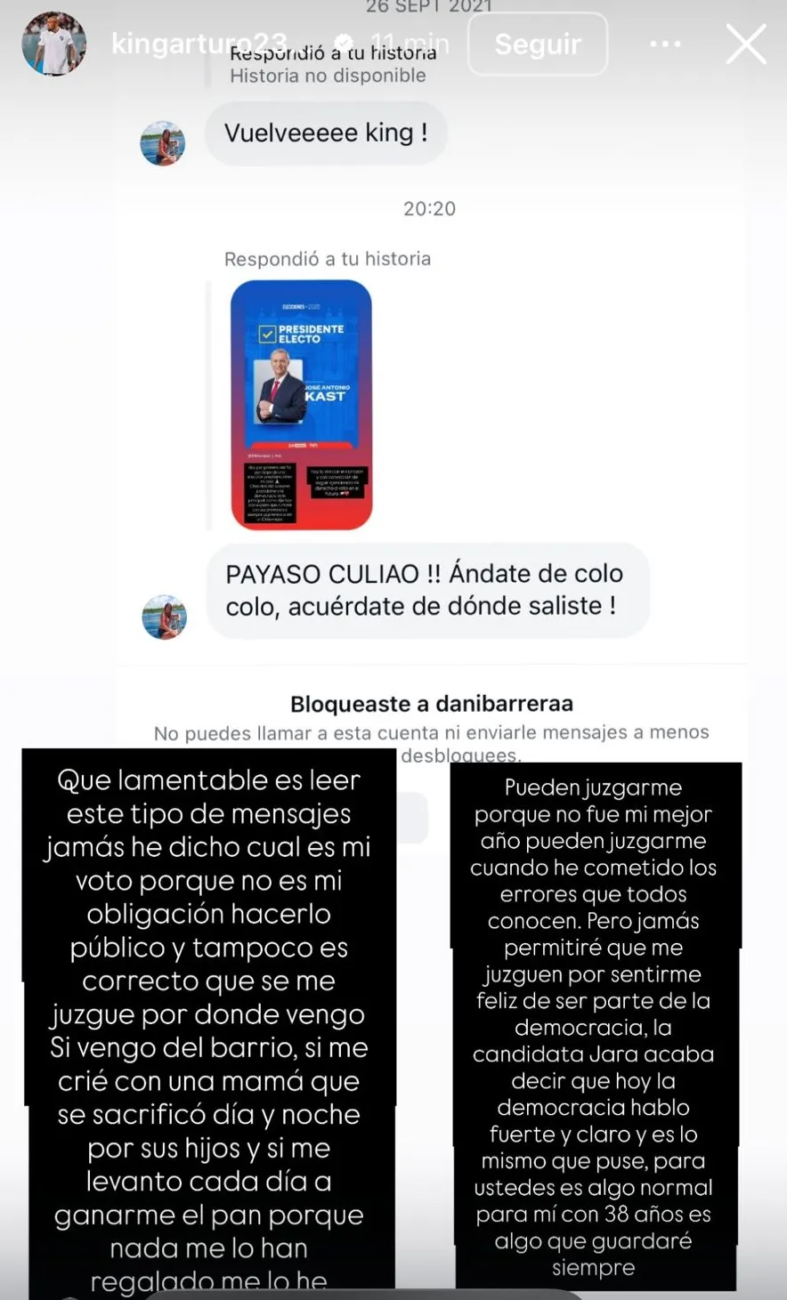 - El jugador de Colo Colo realizó un descargo donde defendió su derecho a participar en la democracia y rechazó ser juzgado por sus orígenes humildes.