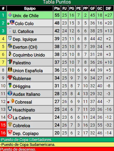Con esto, Colo Colo sigue a la caza de Universidad de Chile, sólido líder con 55 unidades. Los albos, escoltas y con dos partidos menos, están con 48 puntos.