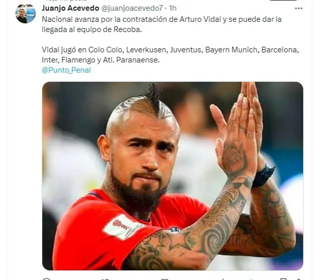 Nacional avanza por la contratación de Arturo Vidal y se puede dar la llegada al equipo de Recoba. Vidal jugó en Colo Colo, Leverkusen, Juventus, Bayern Munich, Barcelona, Inter, Flamengo y Atl. Paranaense”, fue lo que indicó el comunicador.