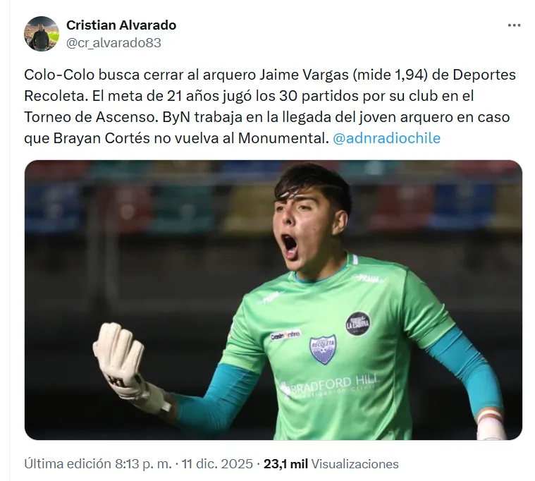 Así lo reveló el periodista Cristián Alvarado, de Radio ADN, quien informó que: “Colo Colo busca cerrar al arquero Jaime Vargas, de 1,94 metros, proveniente de Deportes Recoleta. El meta de 21 años jugó todos los encuentros de la temporada con su club en el Ascenso”.