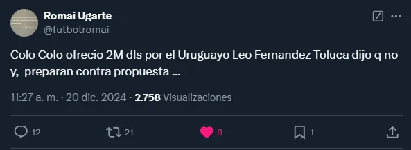“Colo Colo ofreció 2M dls por el Uruguayo Leo Fernández Toluca dijo que no y, preparan contra propuesta”, declaró.
