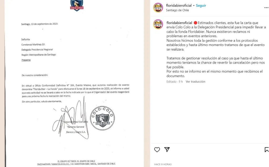“Estimados clientes, esta fue la carta que envía Colo Colo a la Delegación Presidencial para impedir llevar a cabo la fonda Floridabier. Nunca existieron reclamos ni problemas en eventos anteriores. Nosotros hicimos toda la gestión conforme a los protocolos establecidos y hasta último momento tratamos de que el evento se realizara”, reportaron.