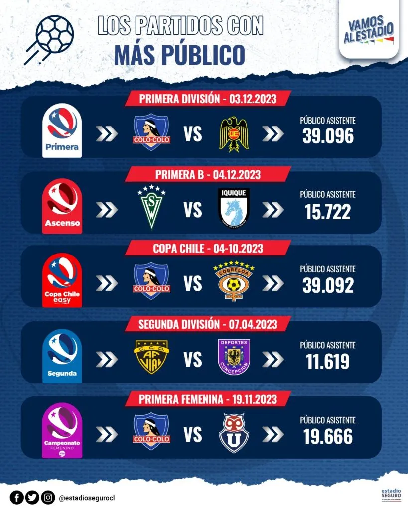 Terminada la temporada 2023 del fútbol chileno, es hora de balances. Y desde el organismo estatal dieron a conocer los números de los partidos con más público en todos los torneos profesionales que organiza la Asociación Nacional de Fútbol Profesional (ANFP).