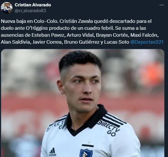 Así lo informó el periodista de Radio Agricultura, Cristián Alvarado en su cuenta de ‘X’, en la que dio a conocer que Zavala queda fuera de este partido por el cuadro febril ya mencionado.