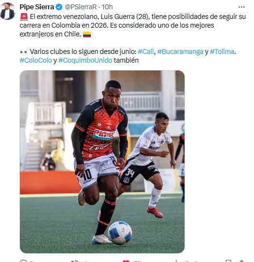 “El extremo venezolano, Luis Guerra (28), tiene posibilidades de seguir su carrera en Colombia en 2026. Es considerado uno de los mejores extranjeros en Chile. Varios clubes lo siguen desde junio: Deportivo Cali, Atlético Bucaramanga, Deportes Tolima, Colo Colo y Coquimbo Unido“, remarca el comunicador.