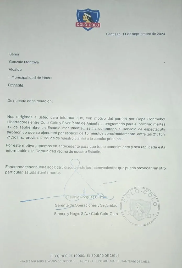Incluso, desde los albos le mandaron un mail al alcalde de Macul, Gonzalo Montoya, informándole que habrá un espectáculo pirotécnico durante un largo periodo de tiempo.