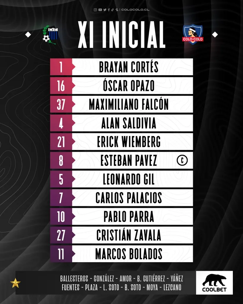 Quien sale del equipo es el volante César Fuentes, siendo retrasado como enganche Carlos Palacios. Mientras que Leonardo Gil estaría en la zona de corte junto al capitán Esteban Pavez.