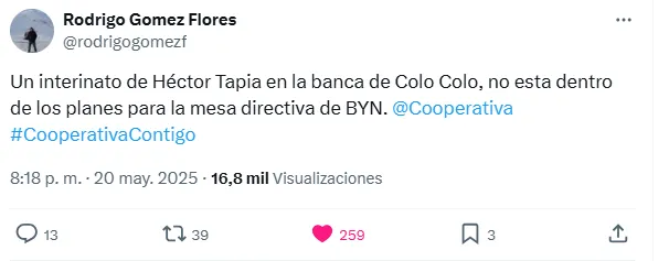 En las últimas horas, el periodista de Radio Cooperativa Rodrigo Gómez señaló que desde la mesa directiva del club descartaron por completo la opción de que el ‘Tito’ se haga cargo de un interinato en Colo Colo.