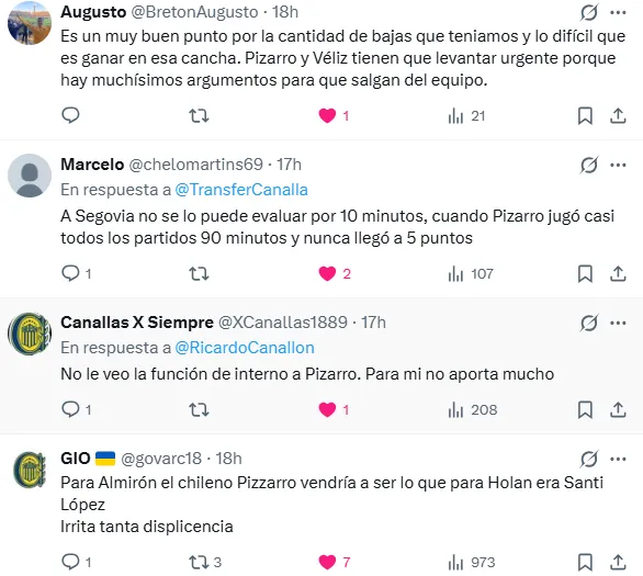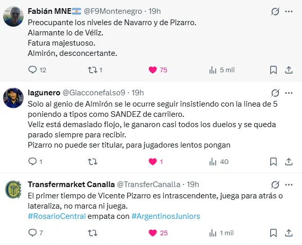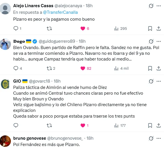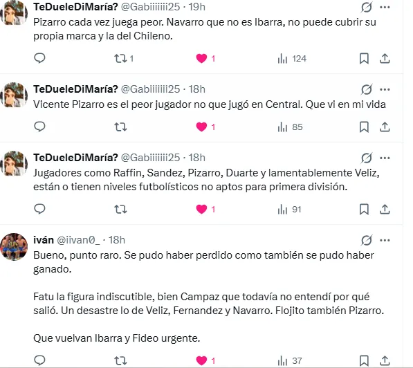 Estas críticas al ex Colo Colo la hicieron notar los hinchas de Rosario Central en las redes sociales, en donde dejaron sus comentarios negativos al encuentro que disputó Vicente Pizarro.