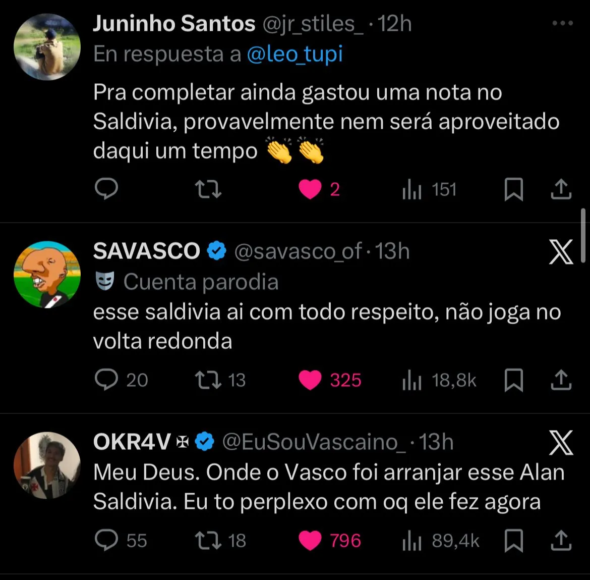 “Dios mío. ¿Dónde encontró Vasco a Alan Saldivia? Me sorprende lo que ha hecho…”, indicó de forma irónica un fanático brasileño.