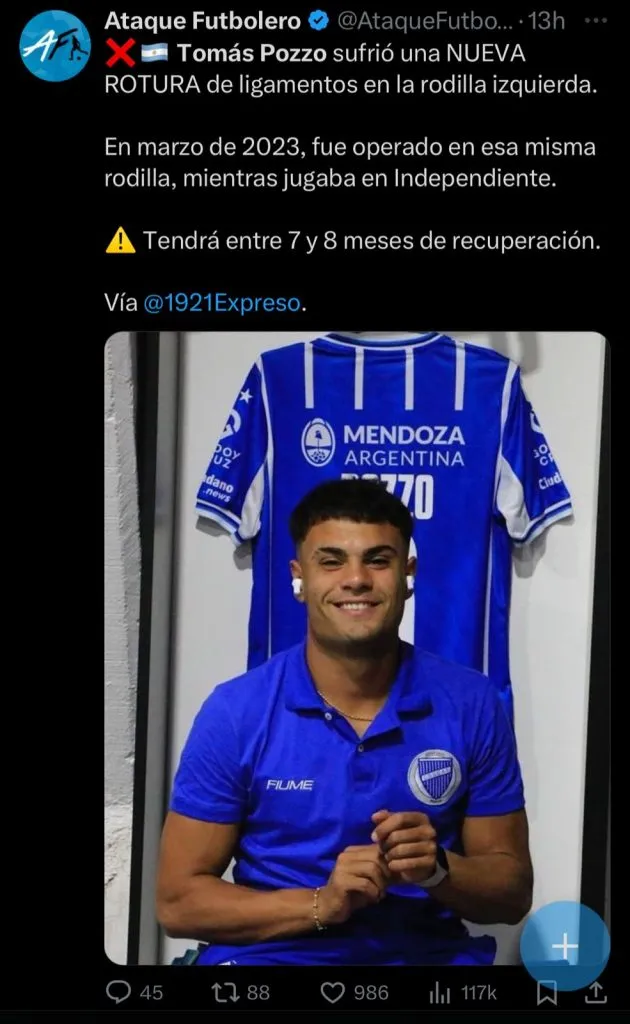 Se trata del volante argentino, Tomás Pozzo, quien en el último duelo por el Campeonato Argentino ante Unión de Santa Fe, salió con problemas físicos, los cuales fueron más complicados de lo que se preveía.