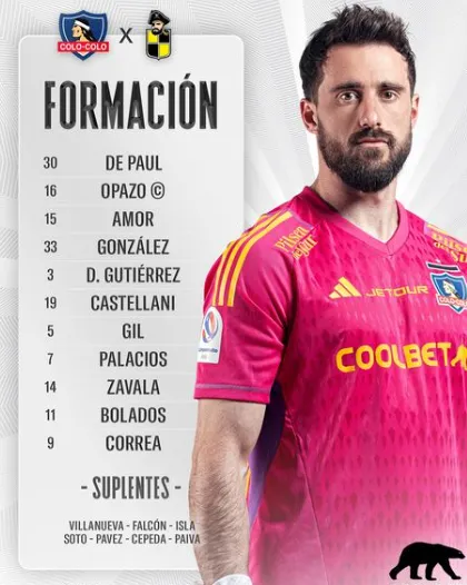 Por ello, el 11 inicial de Colo Colo frente a Coquimbo Unido, será con Fernando De Paul; Óscar Opazo, Ramiro González, Emiliano Amor, Daniel Gutiérrez; Gonzalo Castellani, Leonardo Gil, Carlos Palacios; Cristián Zavala, Marcos Bolados y Javier Correa.
