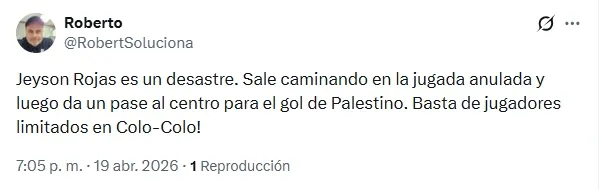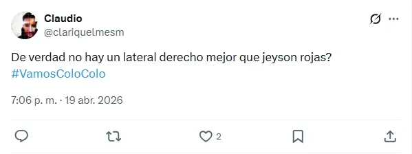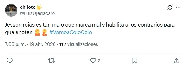Los seguidores de Colo Colo, a través de X, se lanzaron contra Jeyson Rojas. El lateral derecho fue superado en la marca en el tanto mencionado y tras ello rechazó el balón hacia su propia área.