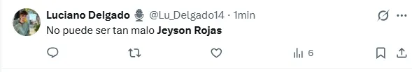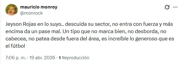 “Un tipo que no marca bien, no desborda, no cabecea, no patea desde fuera del área, es increíble lo generoso que es el fútbol” y “Jeyson Rojas es un desastre” fueron parte de los comentarios.