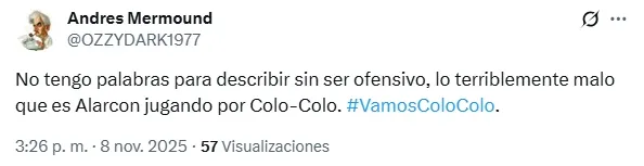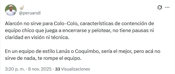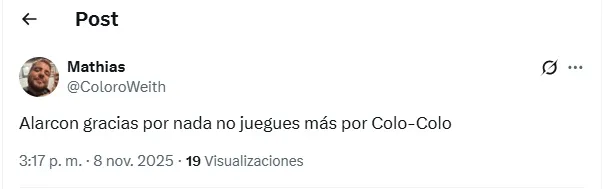 “No sirve para Colo Colo, características de contención de equipo chico que juega a encerrarse y pelotear” y “Gracias por nada no juegues más por Colo Colo“, fue parte de lo expresado a través de X.