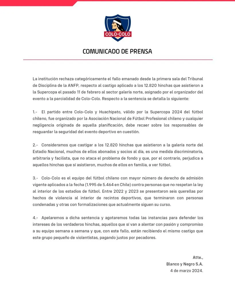 “La institución rechaza categóricamente el fallo emanado desde la primera sala del Tribunal de Disciplina de la ANFP, respecto al castigo aplicado a los 12.820 hinchas que asistieron a la Supercopa el pasado 11 de febrero al sector galería norte, asignado por el organizador del evento a la parcialidad de Colo Colo”, comenzaron diciendo desde Macul.