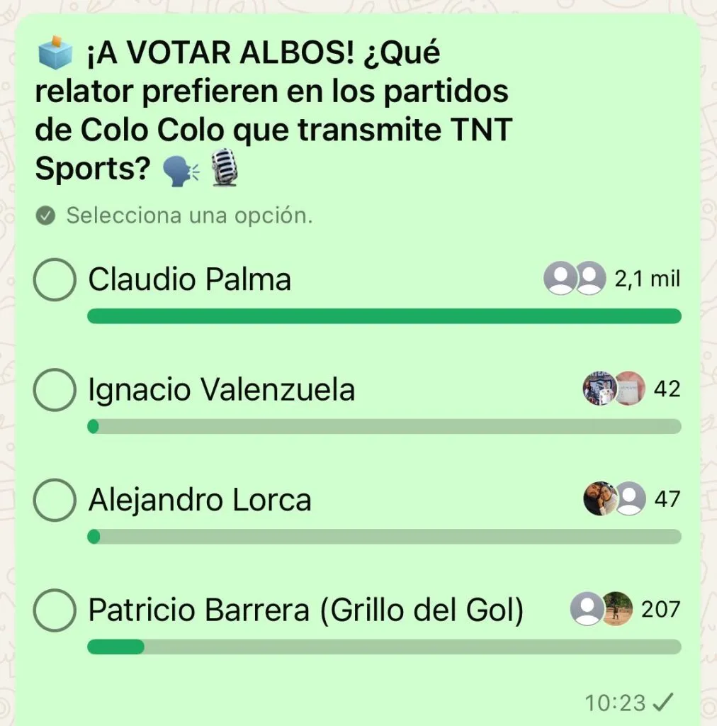 En aquel chat realizamos la encuesta que en poco más de 24 horas mostró un claro ganador entre los relatores de TNT Sports, señal que transmite todos los partidos del Eterno Campeón por el Campeonato Nacional, Copa Chile y Supercopa.